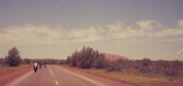 地球のへそ−エアーズロックへ向かって一直線。まだ20Km以上も向こうに有るのに眼前に立ちはだかってくる大岩!なんてこった・・・! 鎖を頼りに登頂すると、そこには360度の地平線!一瞬神になる。 19:30から、いよいよツアーのメイン、グース−スティーブ・ビズレイとの会食だ。周りのオージーから”グース”と声が飛ぶ!ビールはリッター単位で腹の中へ消えてゆく! グースはいろいろ話してくれた。 「撮影では誰も死んでいない」 「後頭部にバイクのタイヤが当たったスタントマンも無事だ」 「俺の代わりに空を飛んだ奴も怪我一つしていない。さすがプロだ」 「あの鼻歌は俺の爺さんに教わったもので完全なアドリブだ」 「暴走族役のオーディションを受けたらああなってしまった」 「あの歌手とはシナリオではもっとおいしいシーンも有ったんだが、没になってしまった」「サイドカーの兄ちゃんにパスを渡すシーンもアドリブだ。”ブタ箱を出るパス”は、撮影用に預かっていた本物だ。」 「ドライブインからトーカッターを追いかけて出てゆくシーンや女の部屋から出てゆくシーンは俺がやっている。マックスダッシュなんて簡単さ」 話は尽きない、夜は更けてゆく。 I'm Happy!!!!! 本日の走行 250Km |
