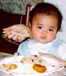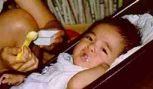 離乳食初期。まだおすわりがしっかりしないのでクレードルに乗せて。しかし、5月末にはお食事いすをもらい、椅子に座って食べるように(18 May 97)