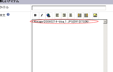 本文の入力欄にイメージを挿入する為のタグが自動的に追加されます。